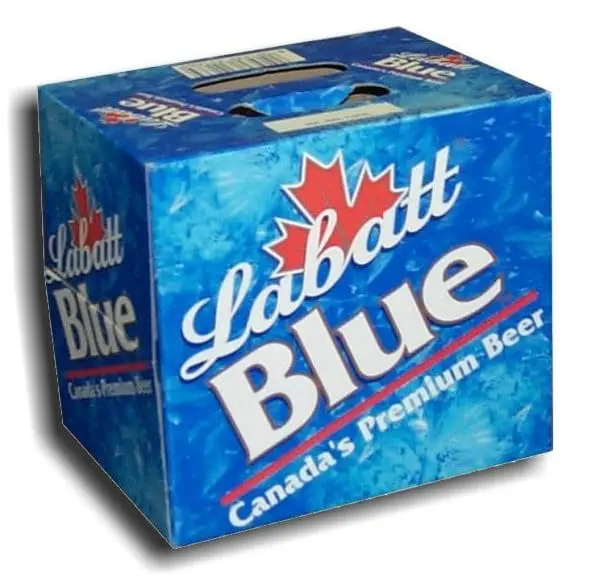 Scatola in cartone per bottiglie di birra Labatt Blu con maniglia rinforzata.