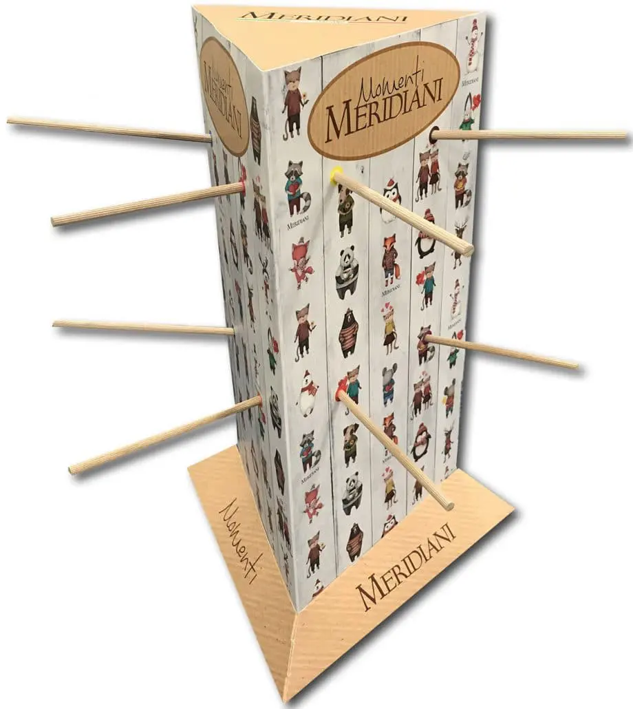Sicuramente si tratta di un espositore in grado di attirare l’attenzione del passante sia per la forma, che per la struttura e la grafica. È molto semplice da montare, ed in pochi passaggi si avrà la possibilità di avere il proprio display da banco in cartone e legno pronto all’uso.
