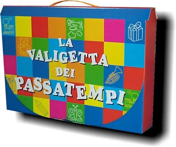 Scatola giochi in cartone a forma di valigetta con maniglia in plastica