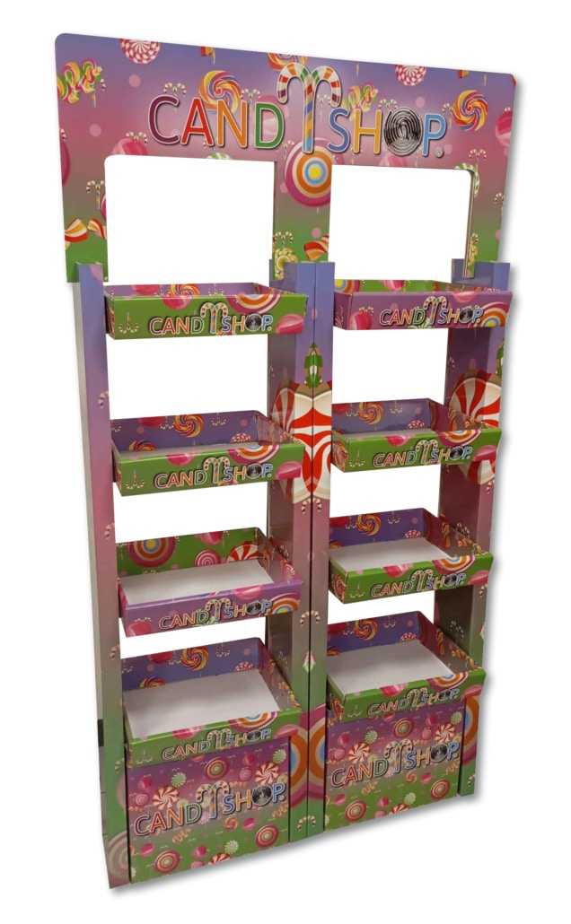 Un espositore da terra, che non solo presenta 4 ripiani, ma anche doppio, in cartone di prima qualità.