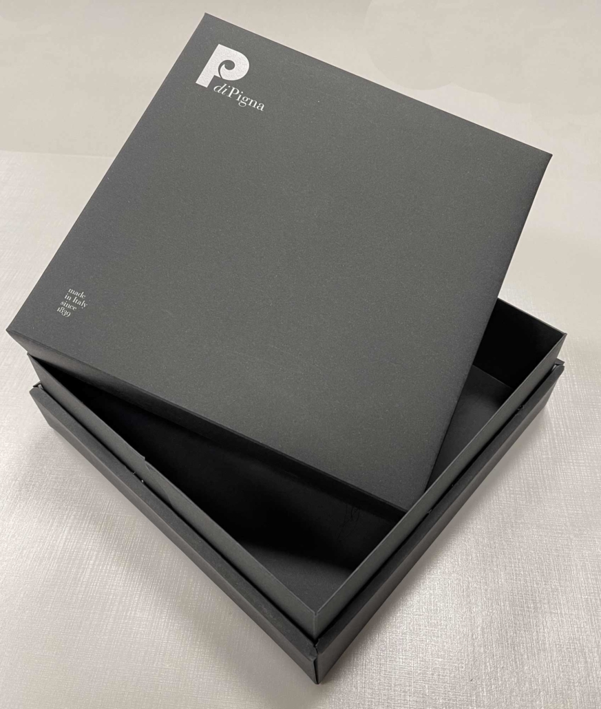 Si tratta di scatole che simulano l’effetto dell’ardesia alla vista e al tatto, con stampa in bianco digitale. Sul coperchio è stato messo in evidenza il marchio e la tradizione italiana dello stesso per mezzo del payoff e logo stampati in contrasto, sulle tonalità dell’argento.