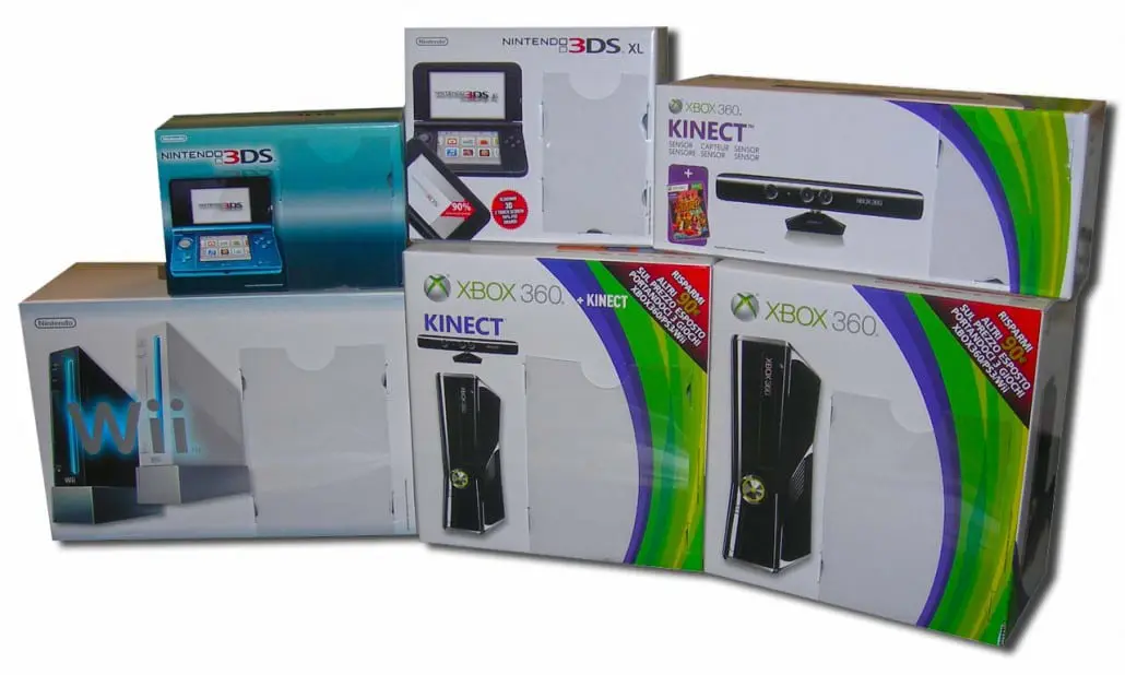 Scatole pubblicitarie in cartone per le vetrine dei negozie GameStop, XBox 360, Wii, Nintendo 3DS, 3DS XL